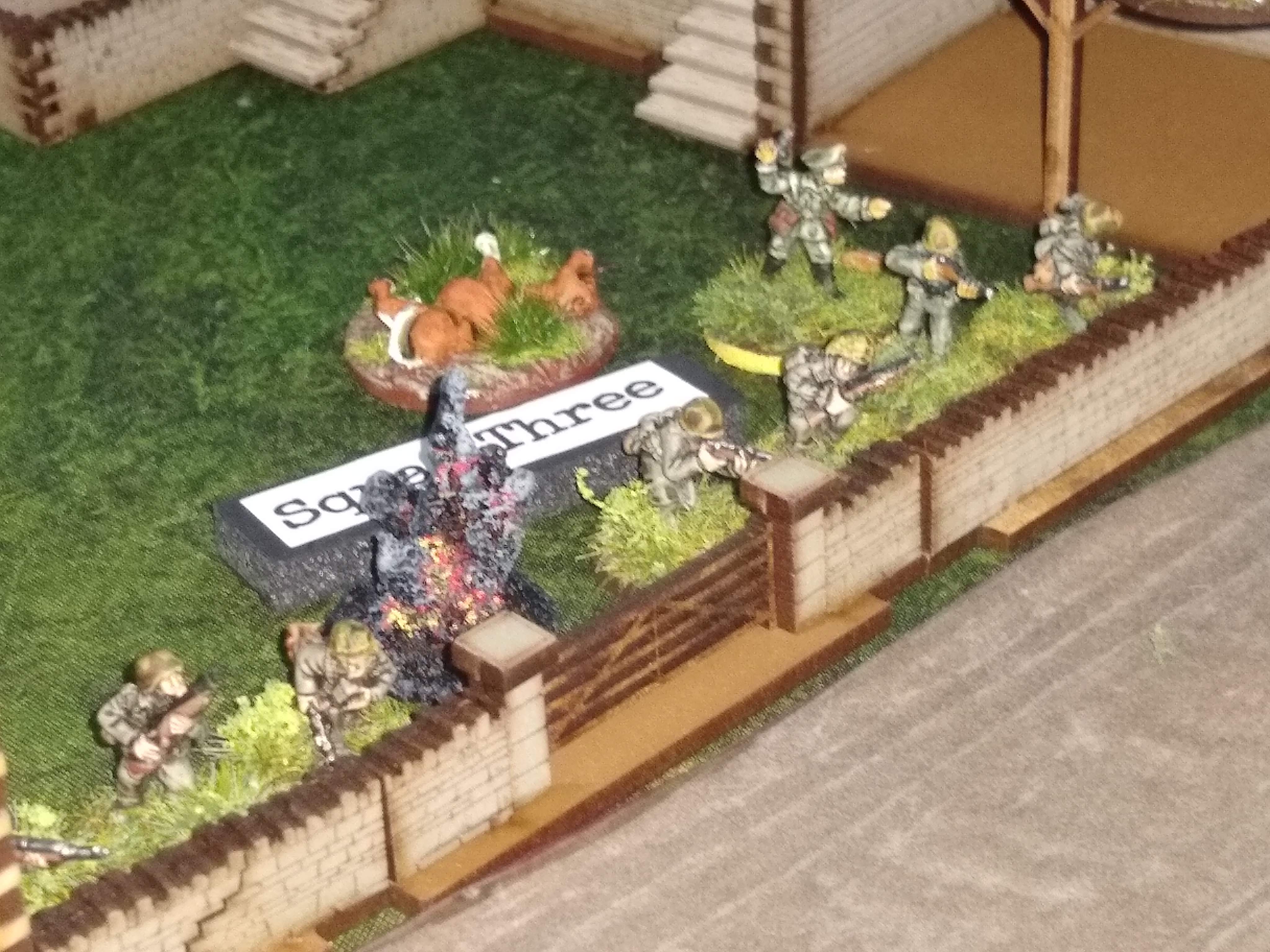 * The resulting melee sees the Germans rolling 13 dice and the Americans 15 dice but the latter wins the fight. The Germans lose 5 men - wiping out the Rifle Squad and ending with another -1 to the German Morale. The Leader miraculously escapes injury but runs away as fast as he can.